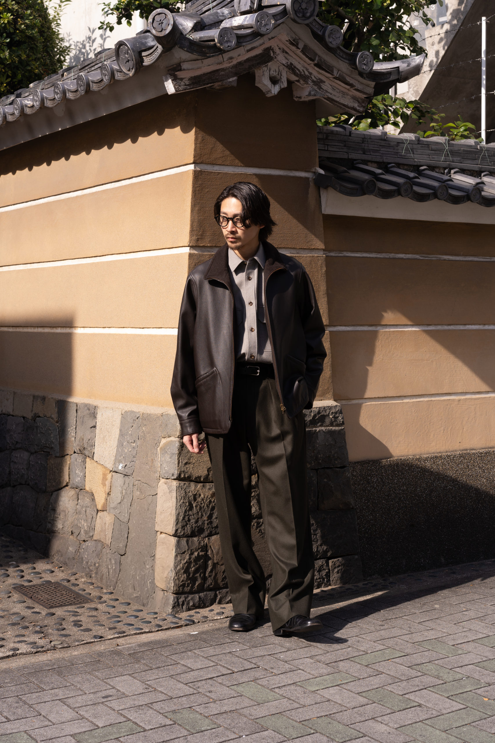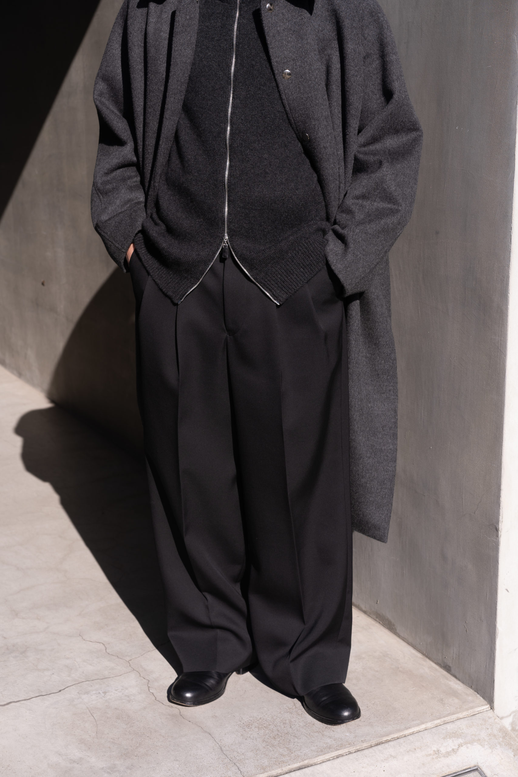 特徴の美しいスラックスで合わせて素材の風合いが引き立つようなスタイルで