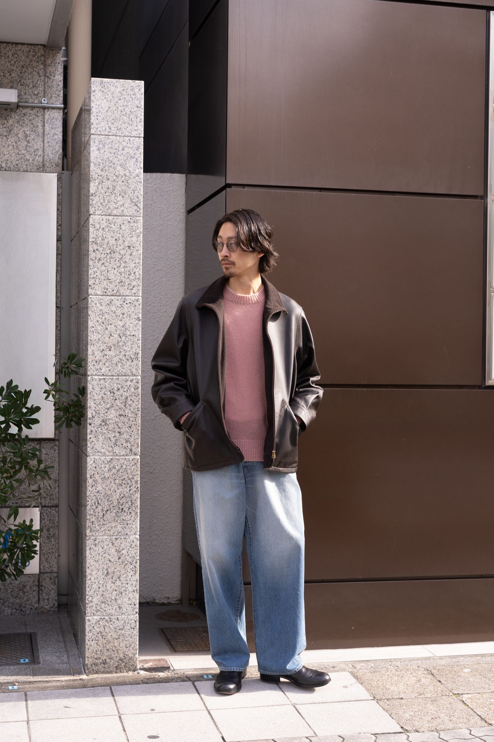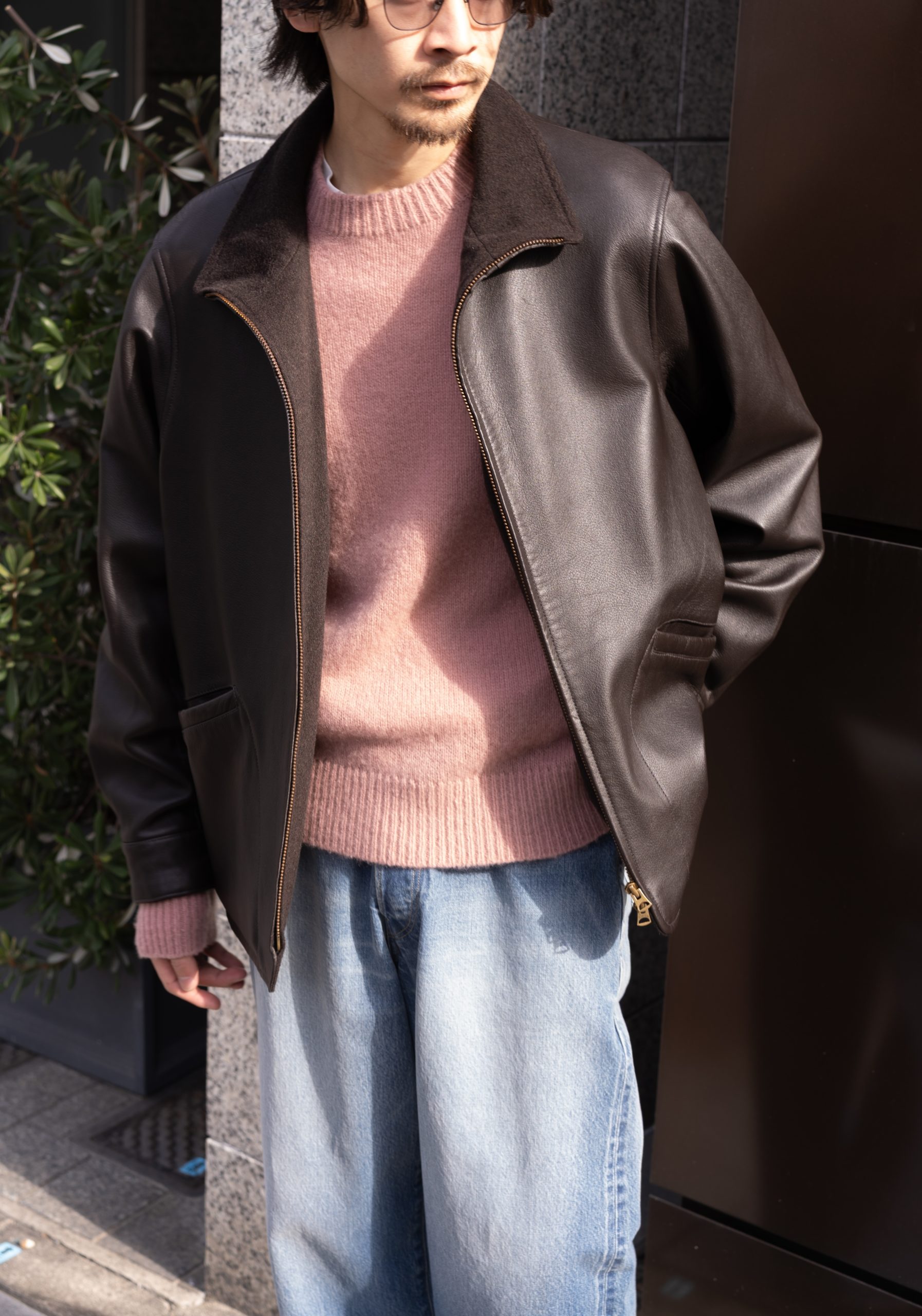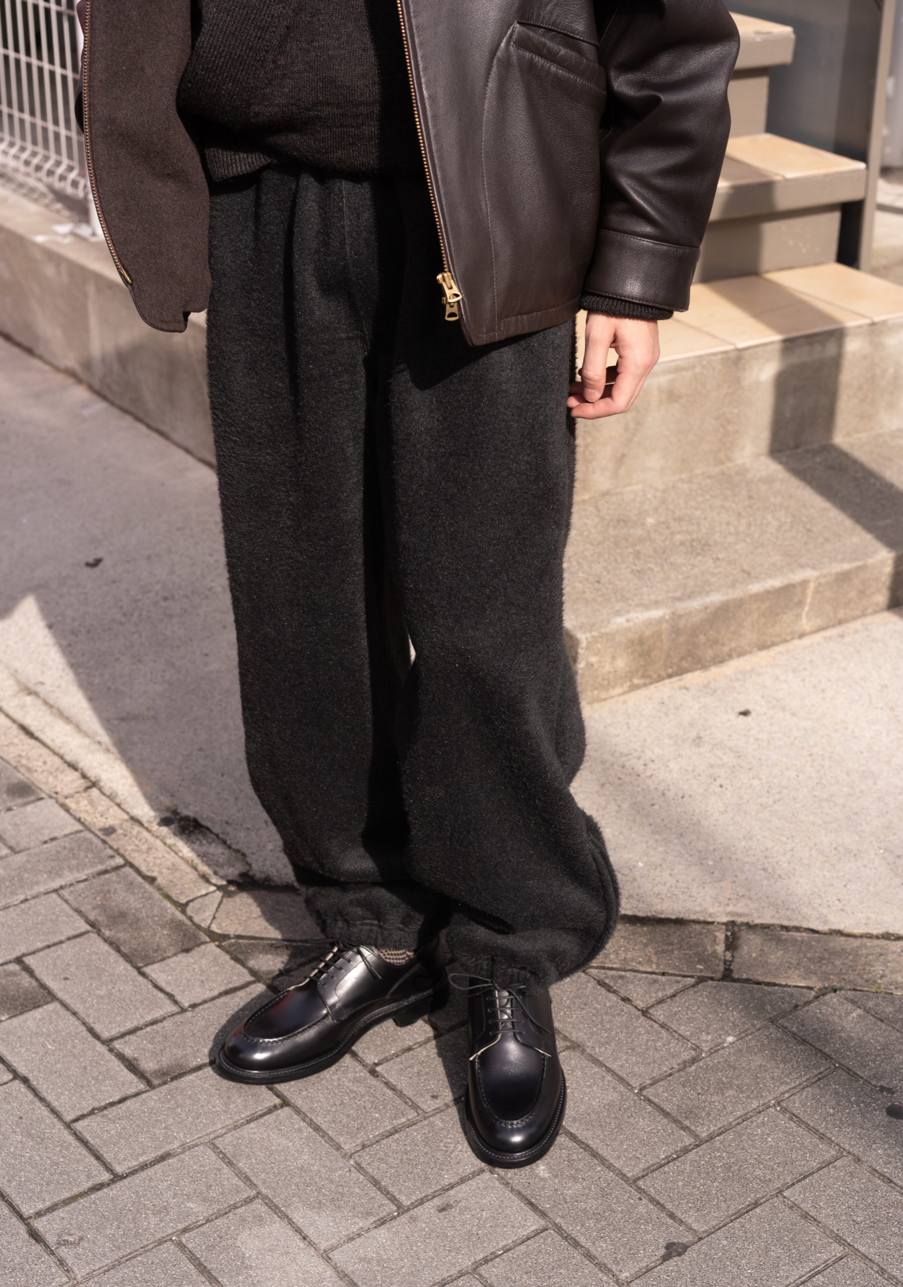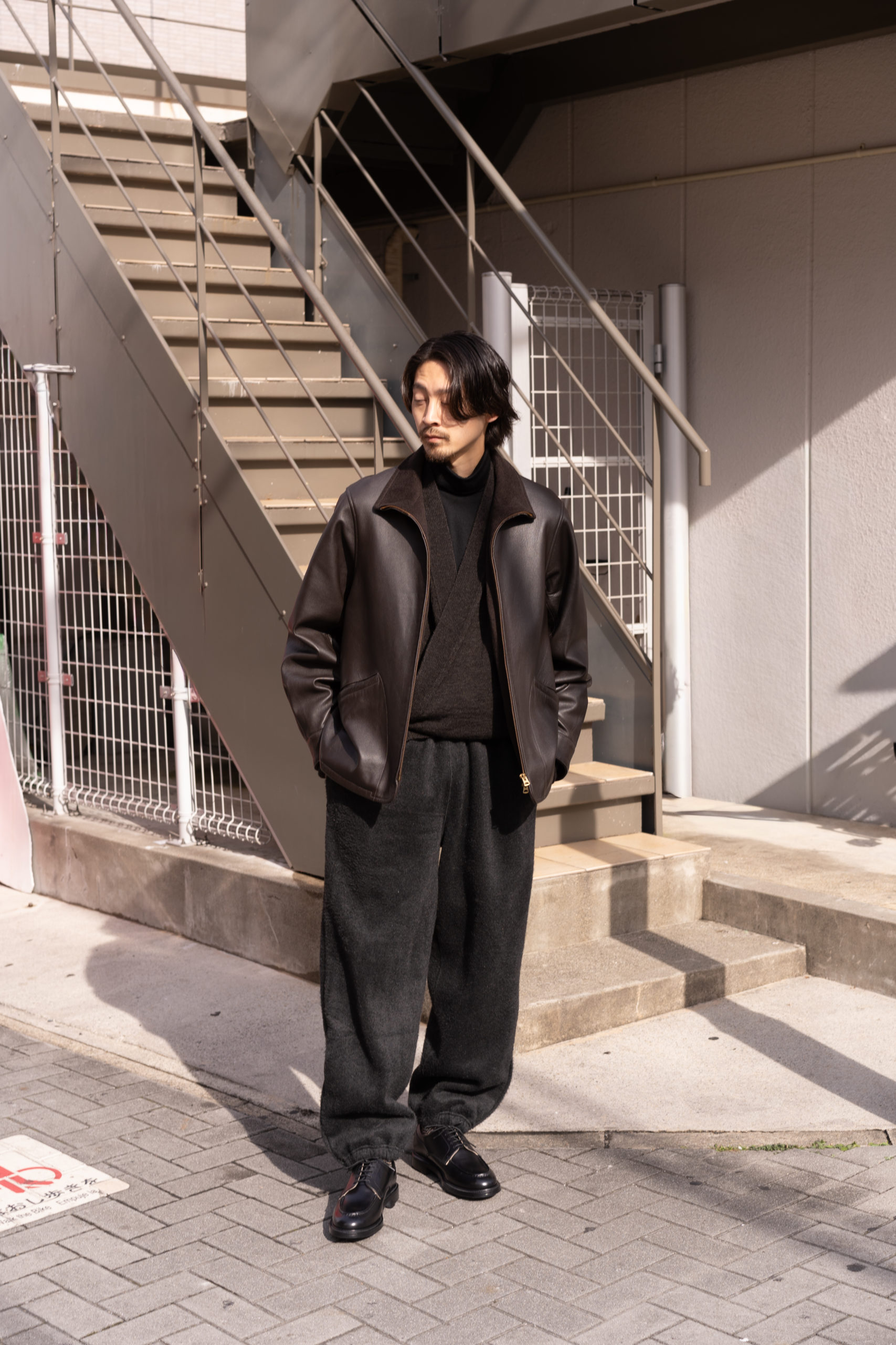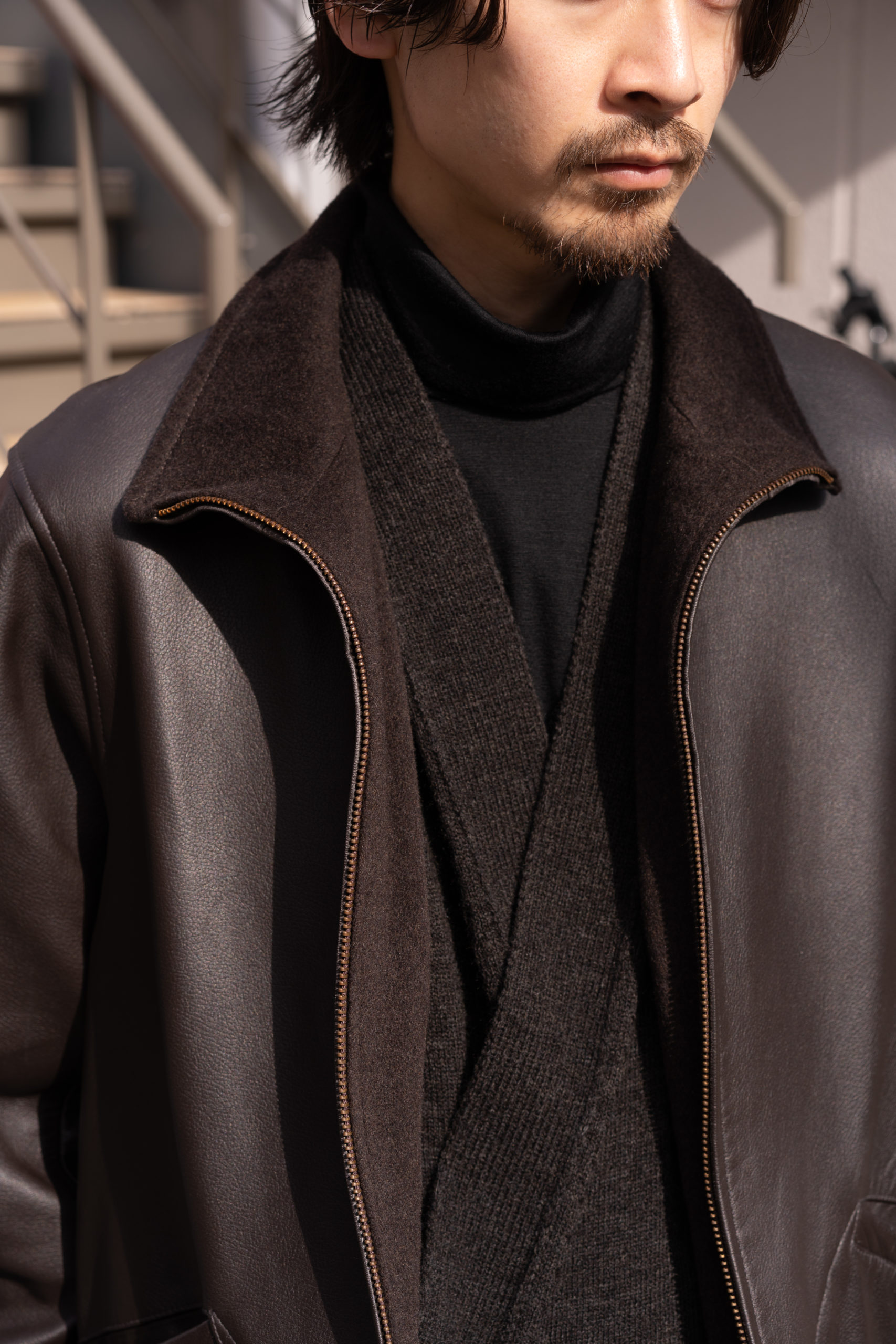 レザーの光沢、ニットの陰影、パンツの質感と深い色調でまとめ、