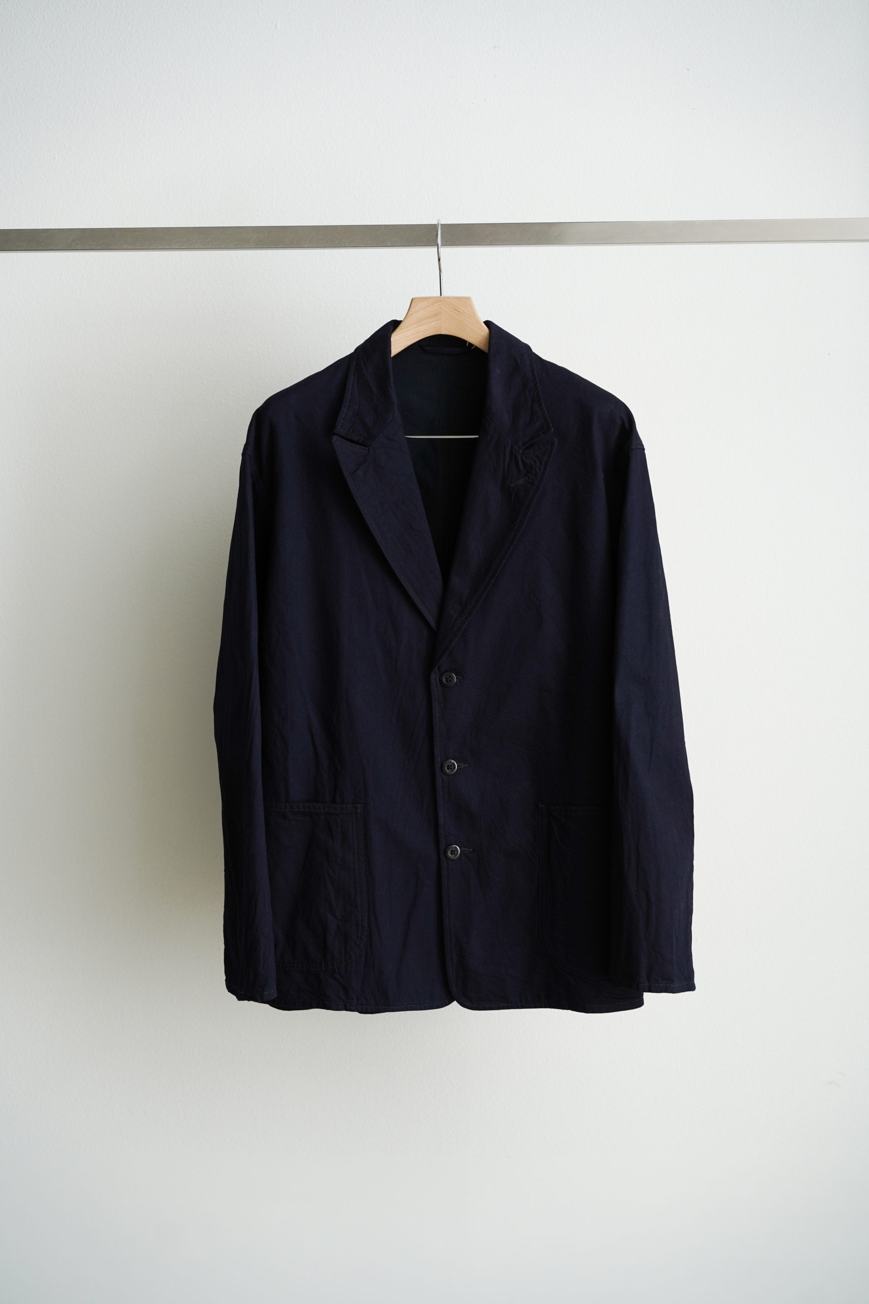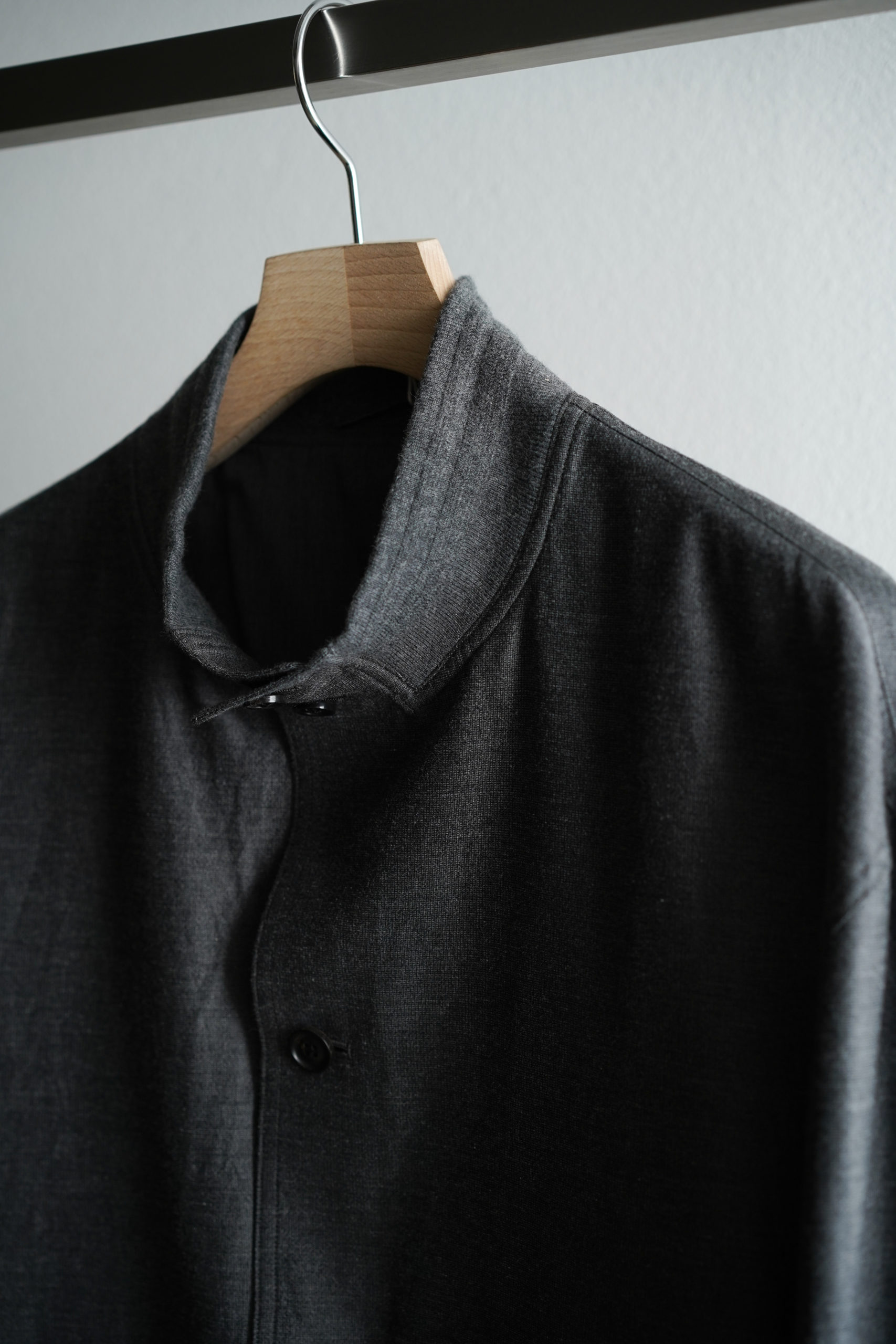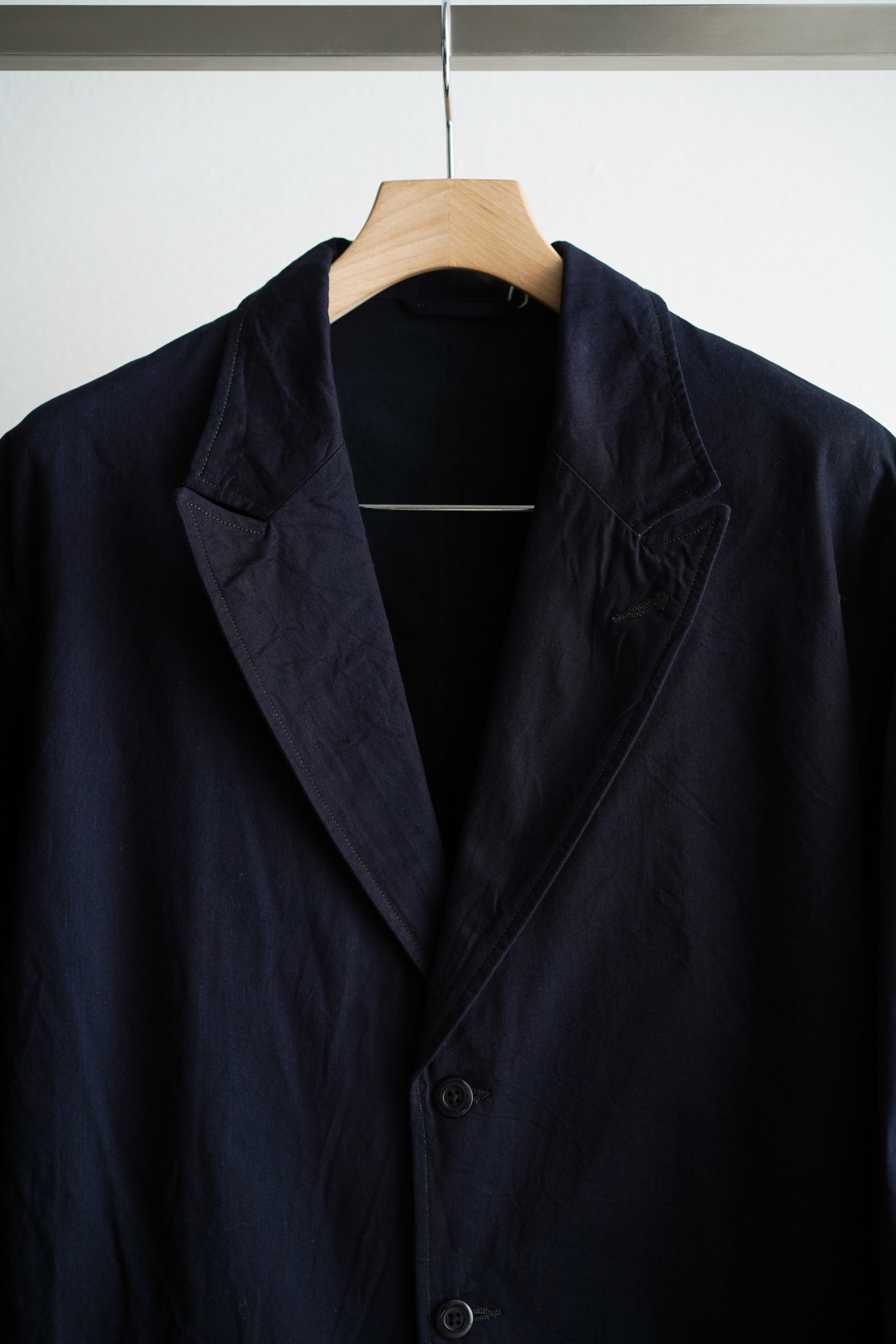 今作は細番手の先染めコットンギャバジンの美しい玉虫色と